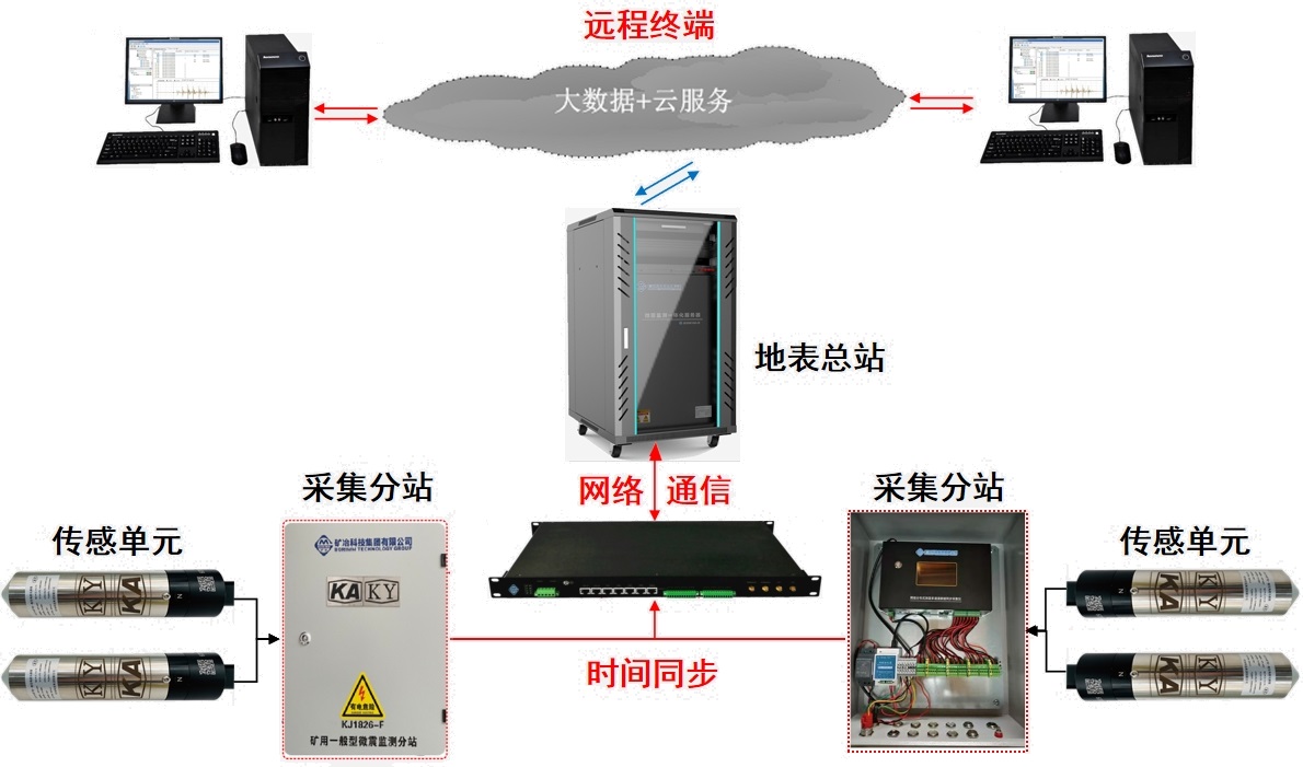遠(yuǎn)程終端:遠(yuǎn)程在線數(shù)據(jù)處理與分析服務(wù);地表總站:本地化處理、分析及展示服務(wù);網(wǎng)絡(luò)通訊:網(wǎng)絡(luò)化數(shù)據(jù)通信與時(shí)鐘同步;采集分站:數(shù)據(jù)采集、存儲、傳輸單元;傳感器:高靈敏度、高信噪比感知。