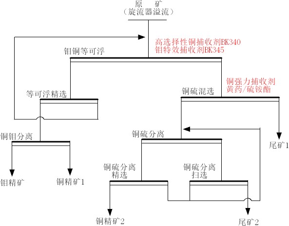采用該工藝技術(shù),在全球首次實現(xiàn)鉬品位0.006%的超貧伴生鉬資源綜合回收,并大幅改善伴生貴金屬的回收指標(biāo)。通過靶性綠色銅、鉬捕收劑AP、BK340、BK404B、BK404C開發(fā),實現(xiàn)浮選過程礦物走向的定向調(diào)控,解決了多礦相銅資源的回收難題,銅回收率提高5個百分點以上;通過雙官能團協(xié)同捕收劑BK345開發(fā),兼顧捕收劑在輝鉬礦非極性面與極性棱的吸附,大幅改善了細粒輝鉬礦的浮選指標(biāo);通過低毒銅鉬分離抑制劑BK511的開發(fā),銅鉬分離硫化鈉用量降低30%以上,環(huán)保效益顯著。該工藝技術(shù)適用于低品位斑巖型銅鉬礦、復(fù)雜多礦體銅鉬礦等復(fù)雜銅鉬礦的高效開發(fā)利用。