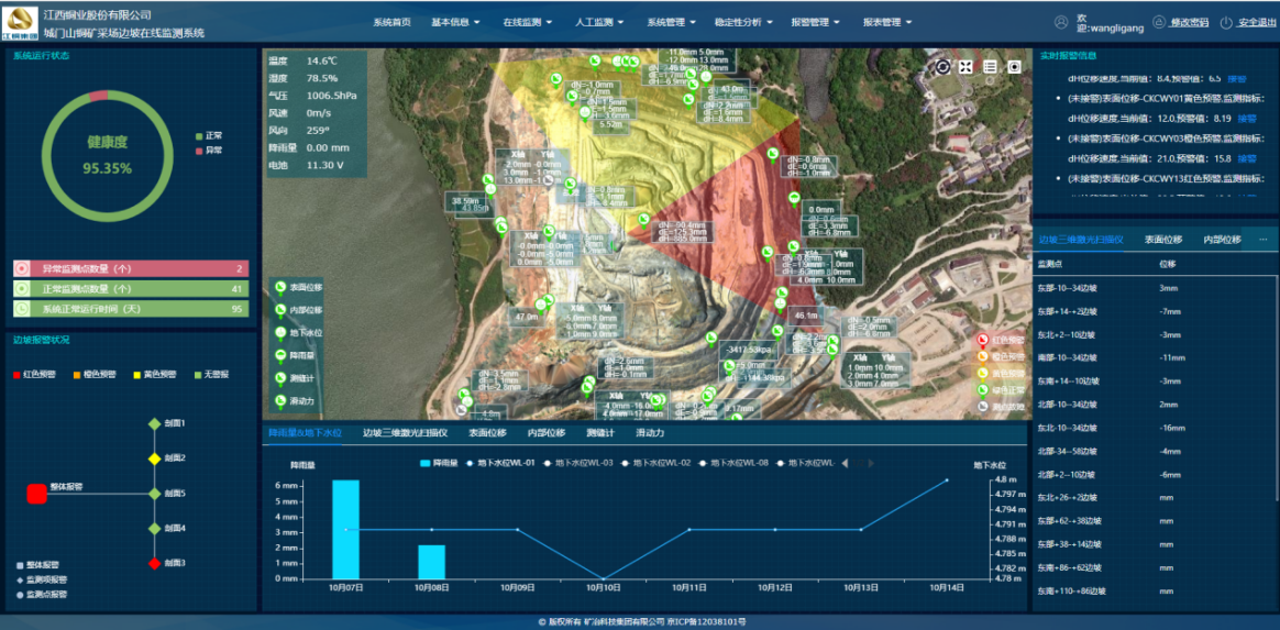 目前,該技術(shù)已在城門山銅礦、黑龍江多寶山銅礦、西藏巨龍銅礦等多個(gè)大型露天礦山進(jìn)行了應(yīng)用。上述礦山采用邊坡雷達(dá)(GNSS、三維激光掃描儀)進(jìn)行表面位移監(jiān)測,同時(shí)對內(nèi)部位移、降雨量、地下水位等進(jìn)行了監(jiān)測,通過應(yīng)用該技術(shù),將礦山邊坡穩(wěn)定性實(shí)時(shí)分析與各項(xiàng)監(jiān)測項(xiàng)目相結(jié)合,實(shí)現(xiàn)了邊坡穩(wěn)定性精準(zhǔn)預(yù)警,尤其是在汛期、凍融期,成功預(yù)警了多次局部邊坡坍塌情況,有力保障了礦山安全生產(chǎn)工作,避免了人員傷亡和機(jī)械設(shè)備、財(cái)產(chǎn)損失。