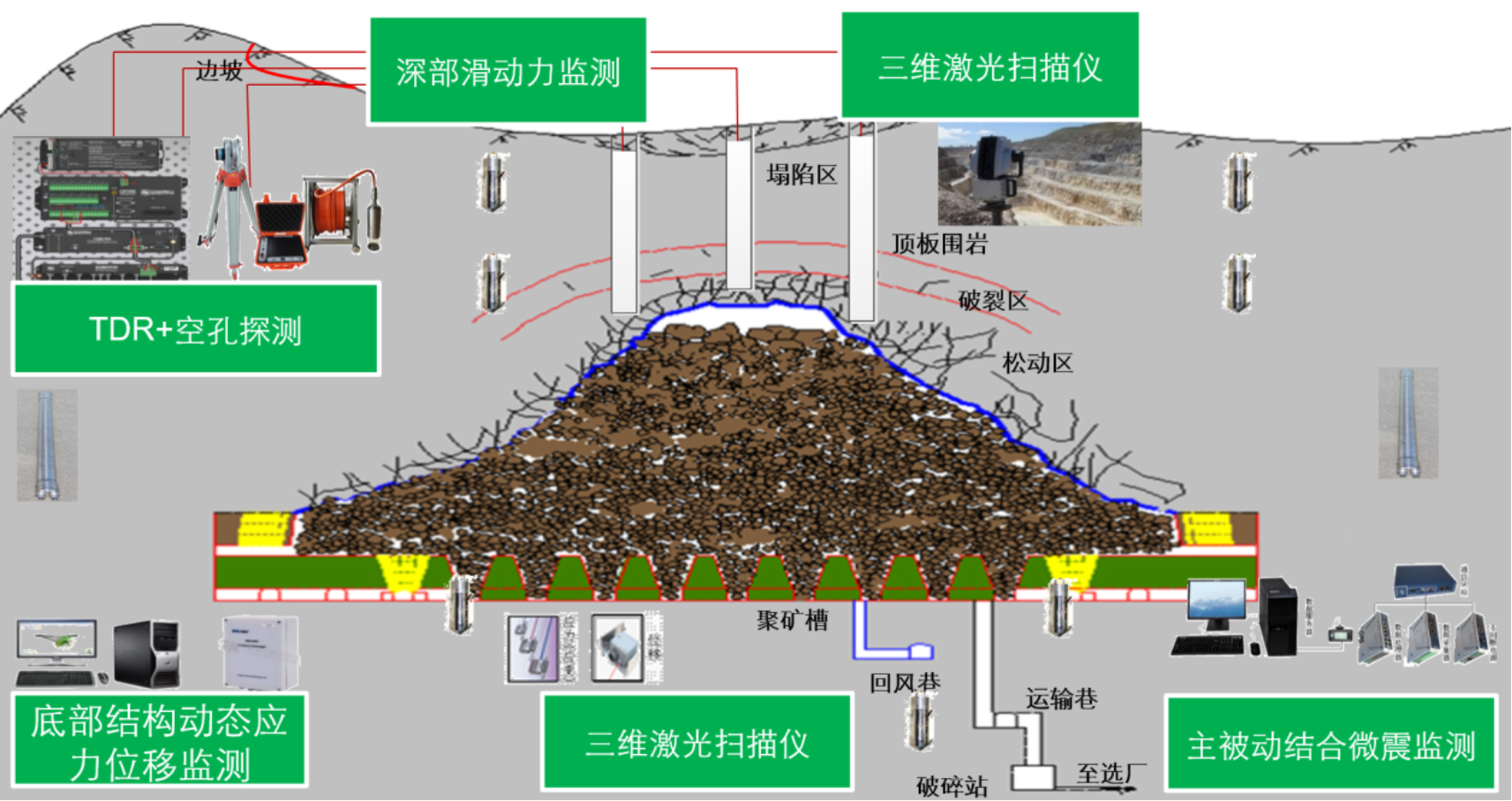 建立了適合普朗銅礦自然崩落法頂板崩落、地表坍陷、底部結(jié)構(gòu)穩(wěn)定性監(jiān)測(cè)的技術(shù)體系,可以實(shí)時(shí)掌握和控制崩落頂板邊界和存窿面之間的距離,預(yù)測(cè)地表坍陷變形范圍及崩透地表的時(shí)間,分析評(píng)估底部結(jié)構(gòu)的穩(wěn)定性,構(gòu)建了一套適用于普朗銅礦自然崩落法的先進(jìn)高效的綜合在線監(jiān)測(cè)與預(yù)警一體化平臺(tái),為自然崩落法開采礦山企業(yè)的安全、高效、精細(xì)化生產(chǎn)提供技術(shù)支撐。